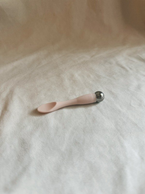 Mango de silicona con cuchara para aplicar el producto y esfera de acero efecto frio.